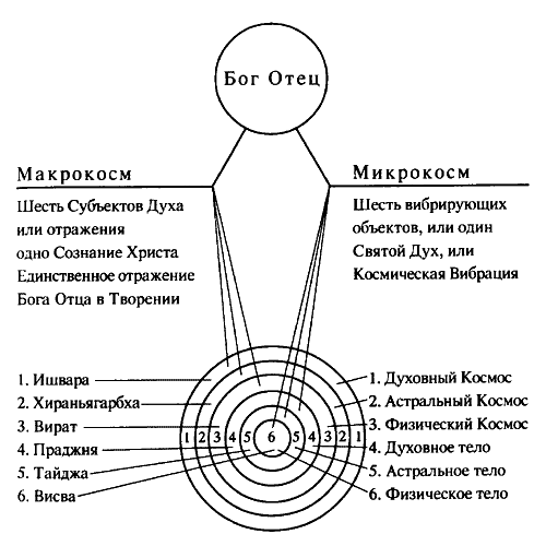 Святого Духа (от объективного, вибрирующего Творения). Подобно тому, как в общепринятом смысле можно сказать, что президент управляет Соединенными Штатами, так и в общепринятом смысле можно сказать, что Бог вне Творения отражается как Христос в Творении, господствует над Вибрирующим Космосом. Затем в подробно изображенном виде можно сказать, что сорок восемь штатов Америки управляются президентом, одним секретарем и сенаторами, и также можно сказать, что творение вибрирующих семи планов (макрокосмически и микрокосмически) управляется Богом Отцом (Разумом вне всего творения), Богом Сыном (Отраженным Разумом Бога Отца), и Его шестью отражениями: